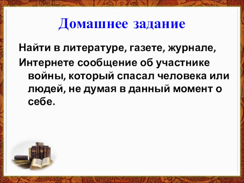 Домашнее заданиеНайти в литературе, газете, журнале, Интернете сообщение об участнике войны, который спасал человека или людей, не