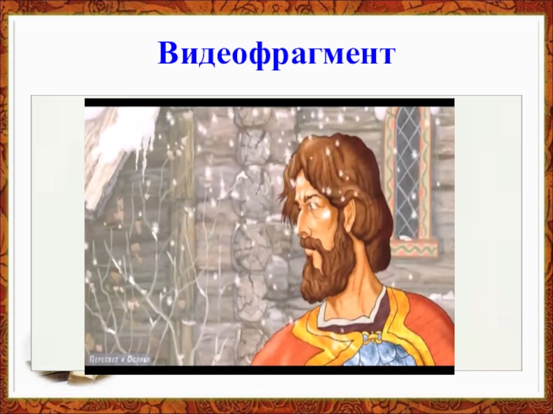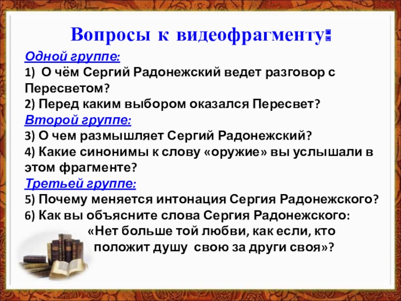 Вопросы к видеофрагменту:Одной группе:1) О чём Сергий Радонежский ведет разговор с Пересветом?2) Перед каким выбором оказался Пересвет?Второй