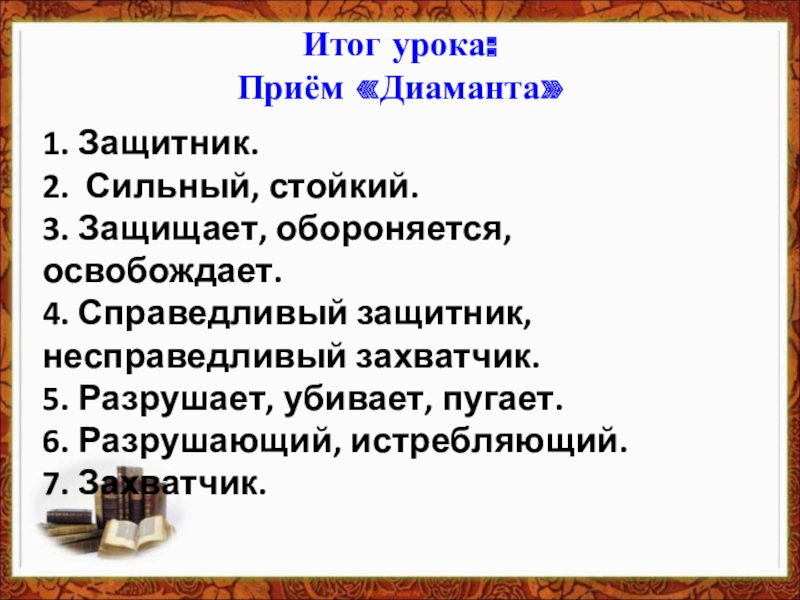 Итог урока: Приём «Диаманта»1. Защитник.2.  Сильный, стойкий.3. Защищает, обороняется, освобождает.4. Справедливый защитник, несправедливый захватчик.5. Разрушает, убивает, пугает.6.
