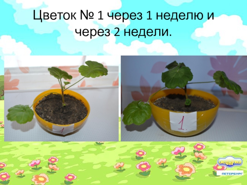 Слайд 9Цветок № 1 через 1 неделю и через 2 недели.