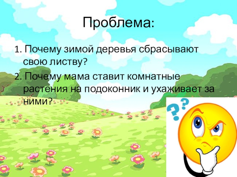 Проблема:1. Почему зимой деревья сбрасывают свою листву?2. Почему мама ставит комнатные растения на подоконник и ухаживает за