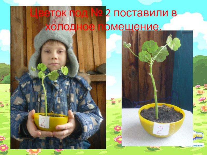 Слайд 6Цветок под № 2 поставили в холодное помещение.