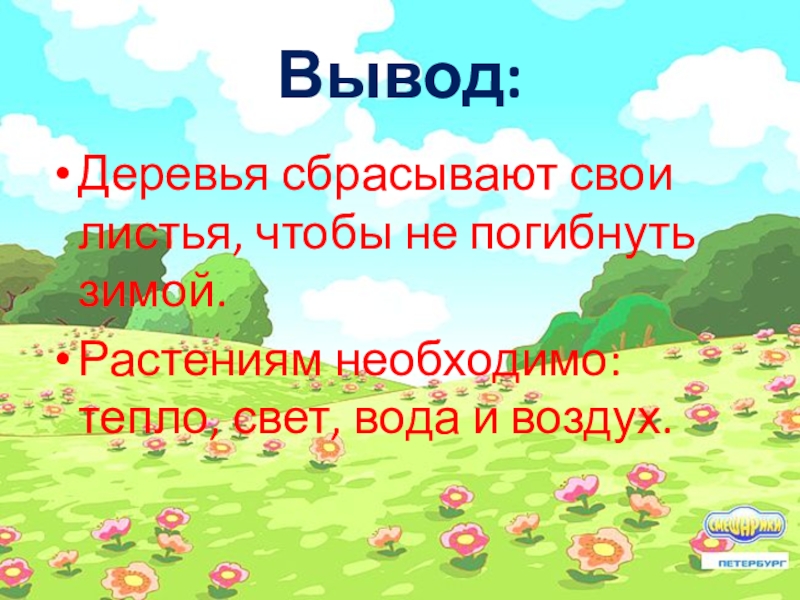 Вывод:Деревья сбрасывают свои листья, чтобы не погибнуть зимой.Растениям необходимо: тепло, свет, вода и воздух.