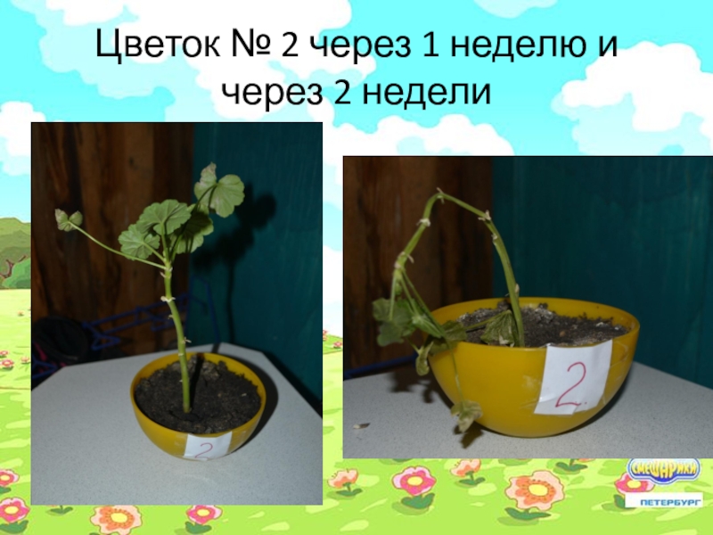 Слайд 10Цветок № 2 через 1 неделю и через 2 недели