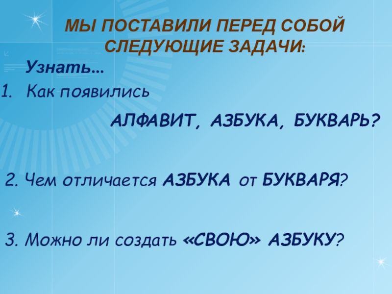 МЫ ПОСТАВИЛИ ПЕРЕД СОБОЙ СЛЕДУЮЩИЕ ЗАДАЧИ: