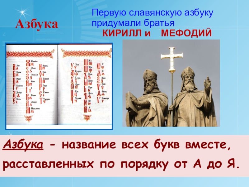 Азбука - название всех букв вместе, расставленных по порядку от А до Я.