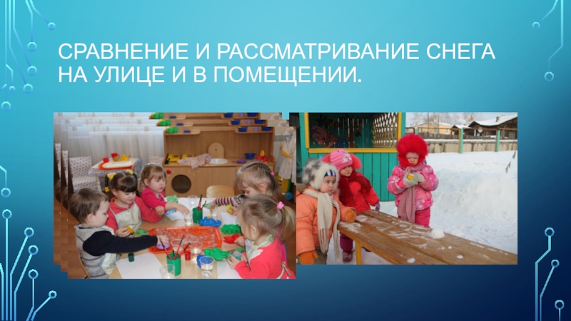 Слайд 12Сравнение и рассматривание снега на улице и в помещении.