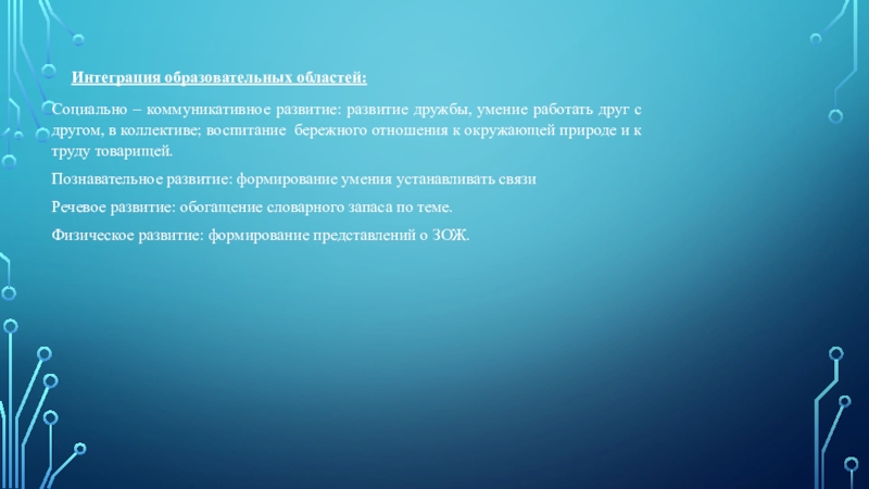 Интеграция образовательных областей:Социально – коммуникативное развитие: развитие дружбы, умение работать друг с другом, в коллективе; воспитание бережного