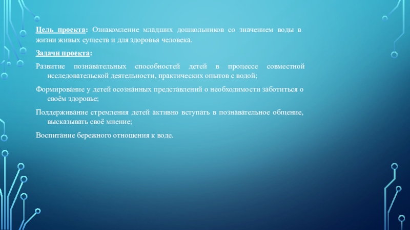 Цель проекта: Ознакомление младших дошкольников со значением воды в жизни живых существ и для здоровья человека.Задачи проекта:Развитие