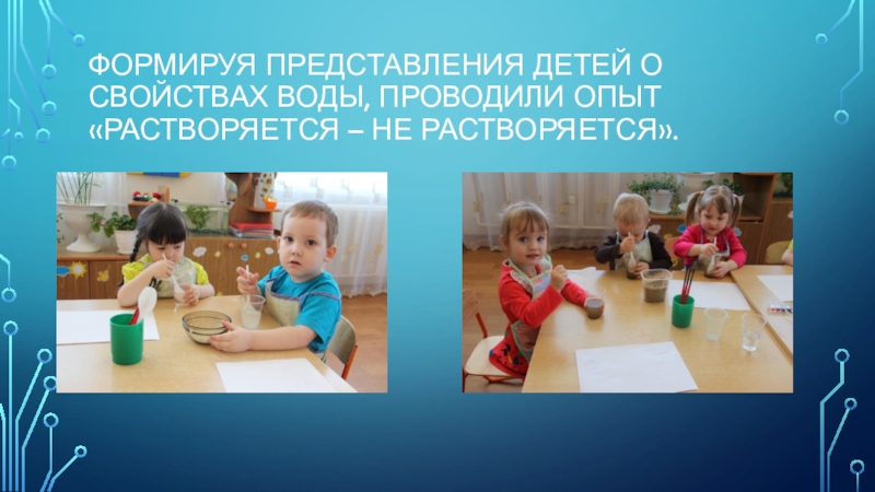 Слайд 10Формируя представления детей о свойствах воды, проводили опыт «Растворяется – не