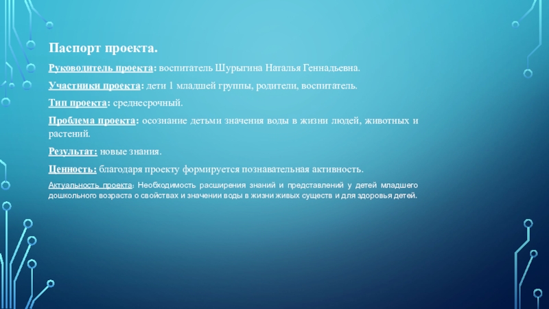 Паспорт проекта.Руководитель проекта: воспитатель Шурыгина Наталья Геннадьевна.Участники проекта: дети 1 младшей группы, родители, воспитатель.Тип проекта: среднесрочный.Проблема проекта: осознание детьми значения воды в жизни людей, животных и растений.Результат: новые знания.Ценность: благодаря проекту формируется познавательная активность.Актуальность проекта: Необходимость