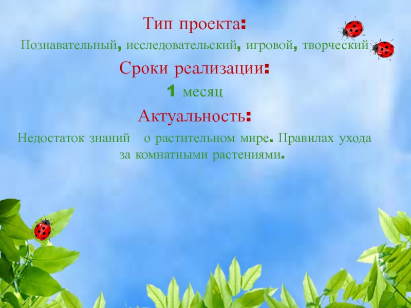 Тип проекта: Познавательный, исследовательский, игровой, творческийСроки реализации: 1 месяцАктуальность: Недостаток знаний о растительном мире. Правилах ухода за комнатными растениями.