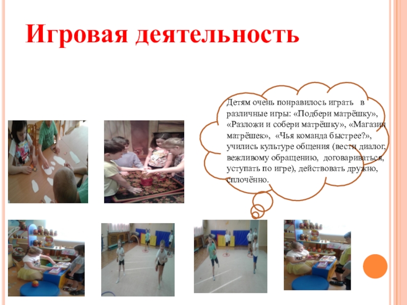 «Разложи и собери матрёшку», «Магазин матрёшек», «Чья команда быстрее?», учились культуре общения (вести диалог, вежливому обращению, договариваться, уступать по игре), действовать дружно, сплочённо.