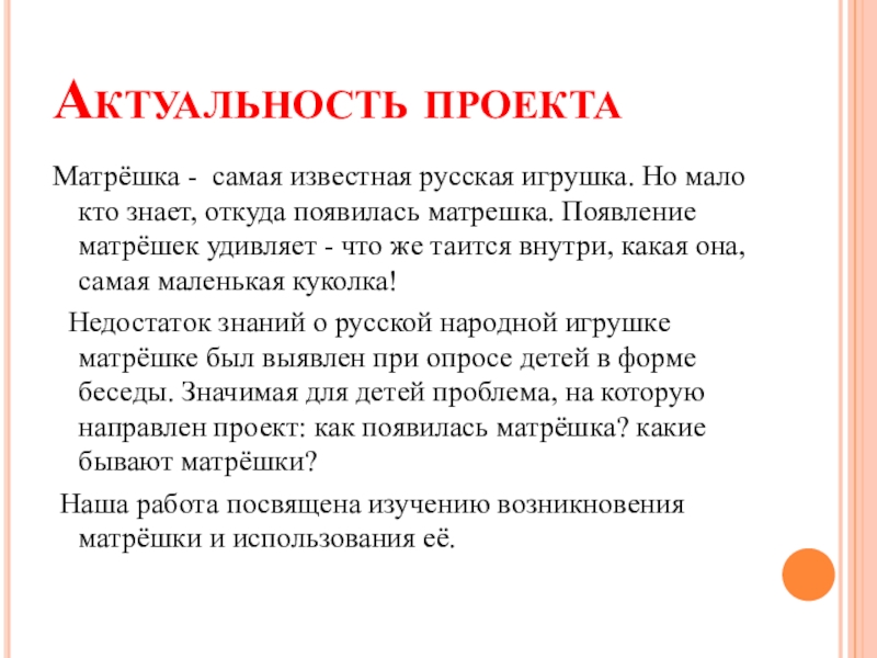 Недостаток знаний о русской народной игрушке матрёшке был выявлен при опросе детей в форме беседы. Значимая для детей проблема, на которую направлен проект: как появилась матрёшка? какие бывают матрёшки?