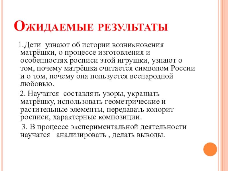 2. Научились составлять узоры, украшать матрёшку, использовать геометрические и растительные элементы, изображать Матрёшку красивой и нарядной.
