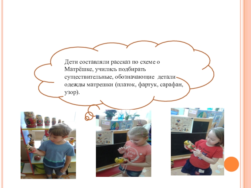 Слайд 11Дети составляли рассказ по схеме о Матрёшке, учились подбирать существительные, обозначающие