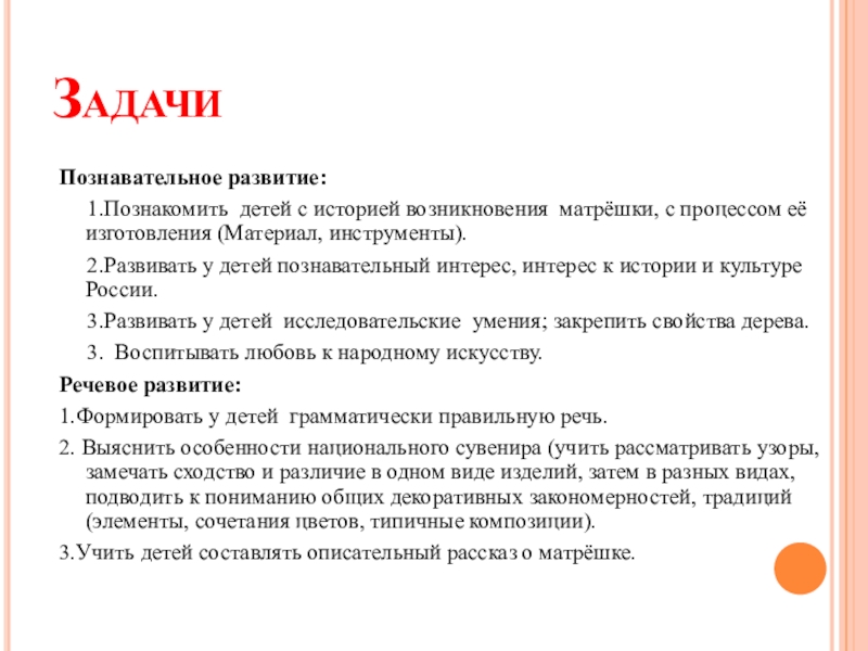 1.Познакомить детей с историей возникновения матрёшки, с процессом