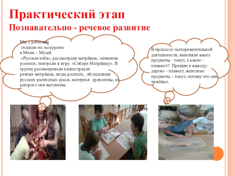3. В процессе экспериментальной деятельности научились анализировать , делать выводы: (Дерево не тонет – плавает; железо – тонет, оно – тяжёлое; дерево легче железа).