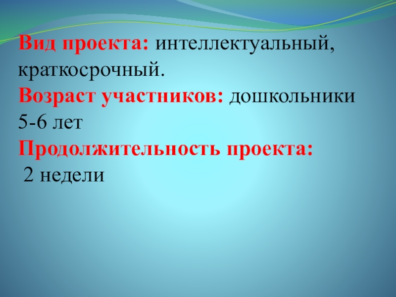 Слайд 2Вид проекта: интеллектуальный, краткосрочный.