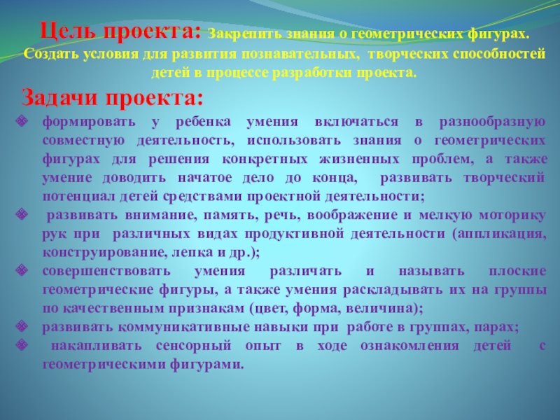 формировать у ребенка умения включаться в разнообразную совместную деятельность, использовать знания о геометрических фигурах для решения конкретных жизненных проблем, а также умение доводить начатое дело до конца, развивать творческий потенциал детей средствами проектной деятельности;