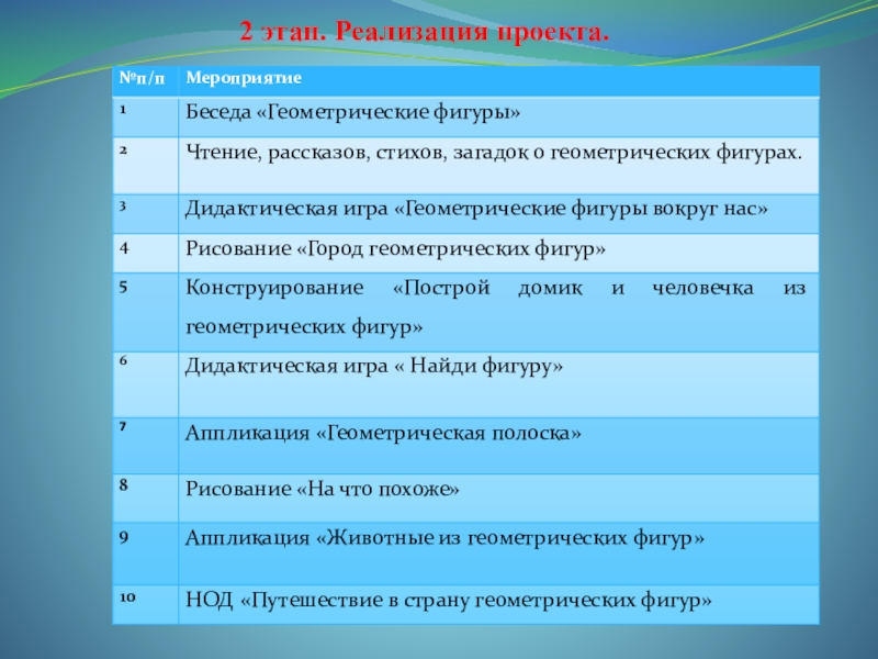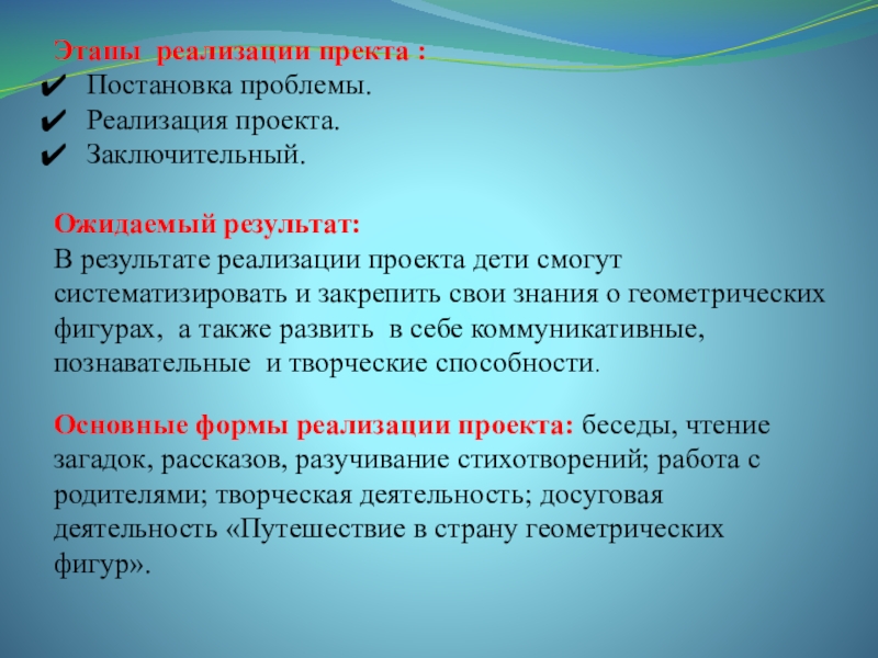 Основные формы реализации проекта: беседы, чтение загадок, рассказов, разучивание стихотворений; работа с родителями; творческая деятельность; досуговая деятельность «Путешествие в страну геометрических фигур».