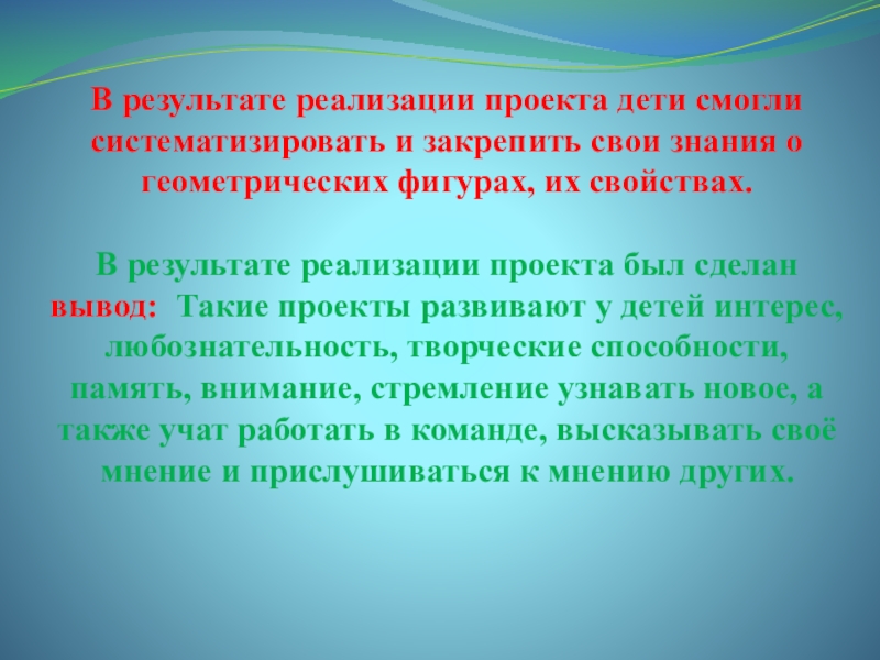В результате реализации проекта был сделан вывод: Такие проекты развивают у детей интерес, любознательность, творческие способности, память, внимание, стремление узнавать новое, а также учат работать в команде, высказывать своё мнение и прислушиваться к мнению других.