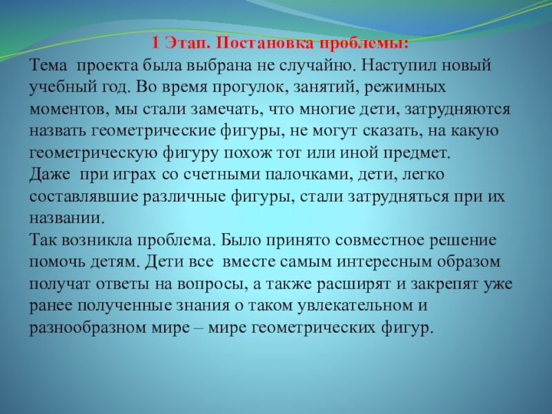 Так возникла проблема. Было принято совместное решение помочь детям. Дети все вместе самым интересным образом получат ответы на вопросы, а также расширят и закрепят уже ранее полученные знания о таком увлекательном и разнообразном мире – мире геометрических фигур.