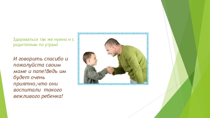 Слайд 13Здороваться так же нужно и с родителями по утрам!