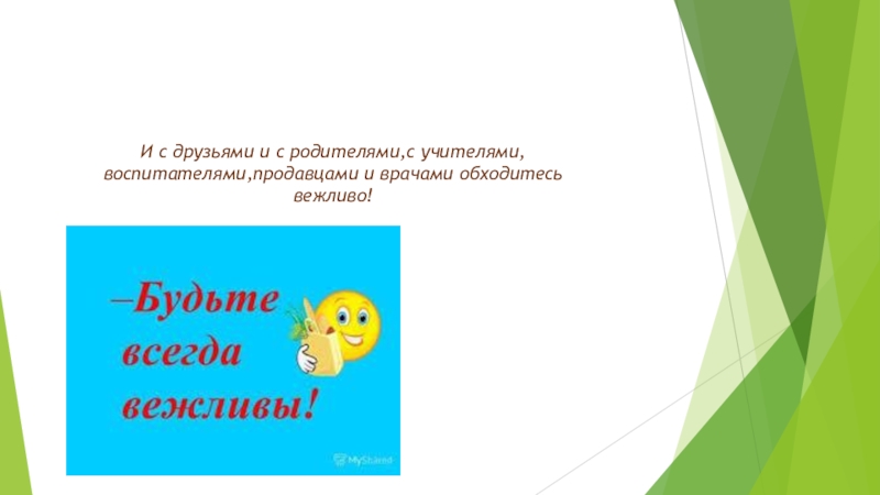 Слайд 8И с друзьями и с родителями,с учителями,воспитателями,продавцами и врачами обходитесь вежливо!