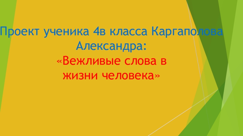 Слайд 1Проект ученика 4в класса Каргаполова Александра: «Вежливые слова в жизни человека»
