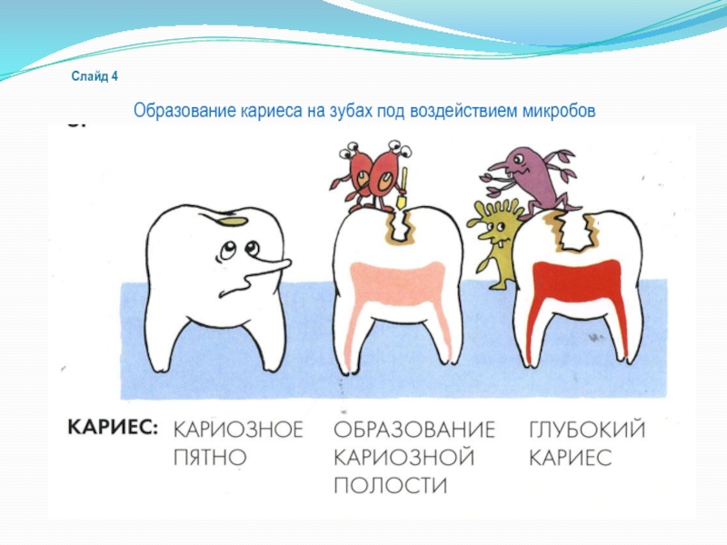Слайд 4Образование кариеса на зубах под воздействием микробов