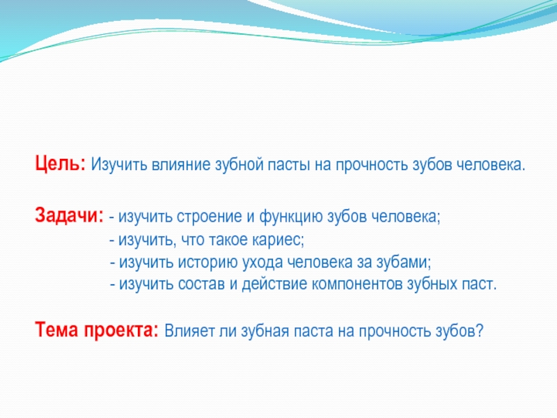Слайд 2Цель: Изучить влияние зубной пасты на прочность зубов человека.