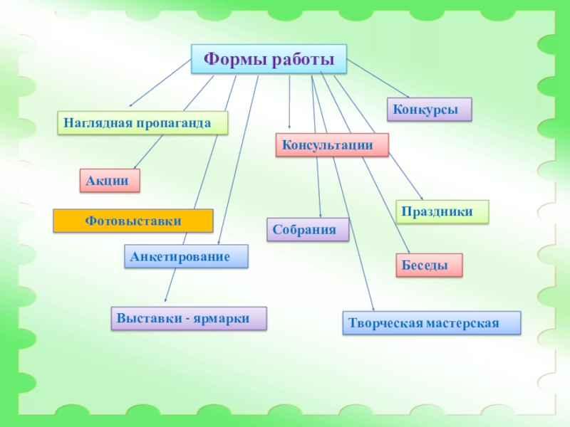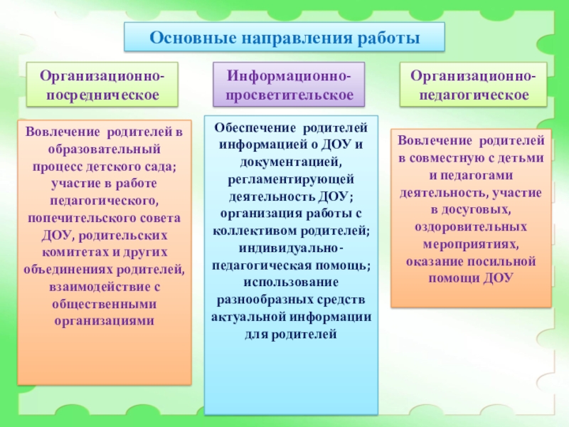 Обеспечение родителей информацией о ДОУ и документацией, регламентирующей деятельность ДОУ; организация работы с коллективом родителей; индивидуально-педагогическая помощь; использование разнообразных средств актуальной информации для родителей