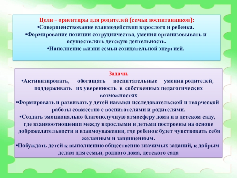 Активизировать, обогащать воспитательные умения родителей, поддерживать их уверенность в собственных педагогических возможностях