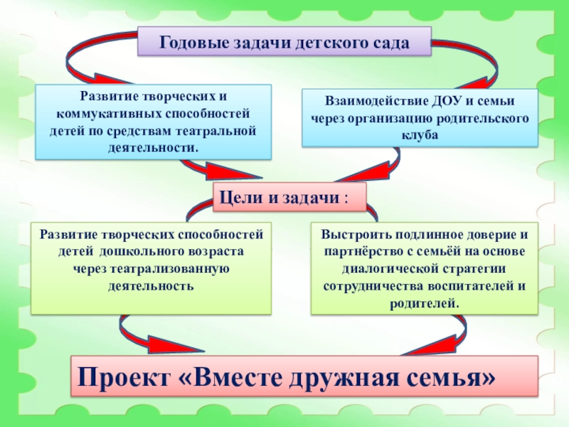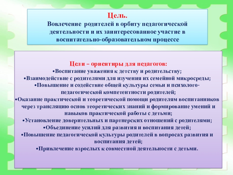Выстроить подлинное доверие и партнёрство с семьёй на основе диалогической стратегии сотрудничества воспитателей и родителей.