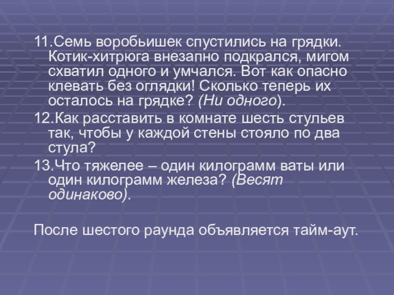 Слайд 4111.Семь воробьишек спустились на грядки. Котик-хитрюга внезапно подкрался, мигом схватил одного