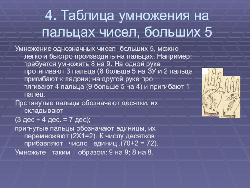 5, можно легко и быстро производить на пальцах. Например: требуется умножить 8 на 9. На одной руке протягивают 3 пальца (8 больше 5 на ЗУ и 2 пальца пригибают к ладони; на другой руке про