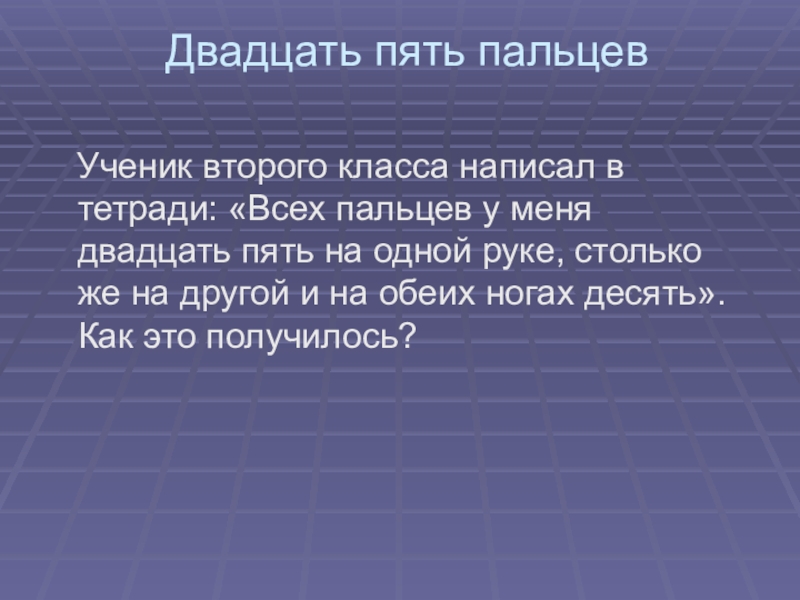пальцев у меня двадцать пять на одной руке, столько же на другой и на обеих ногах десять». Как это получилось?