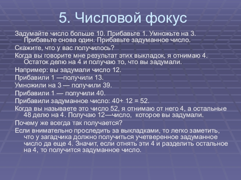 Когда вы называете это число 52, я отнимаю от него 4, а остальные 48 делю на 4. Получаю 12—число, которое вы задумали.
