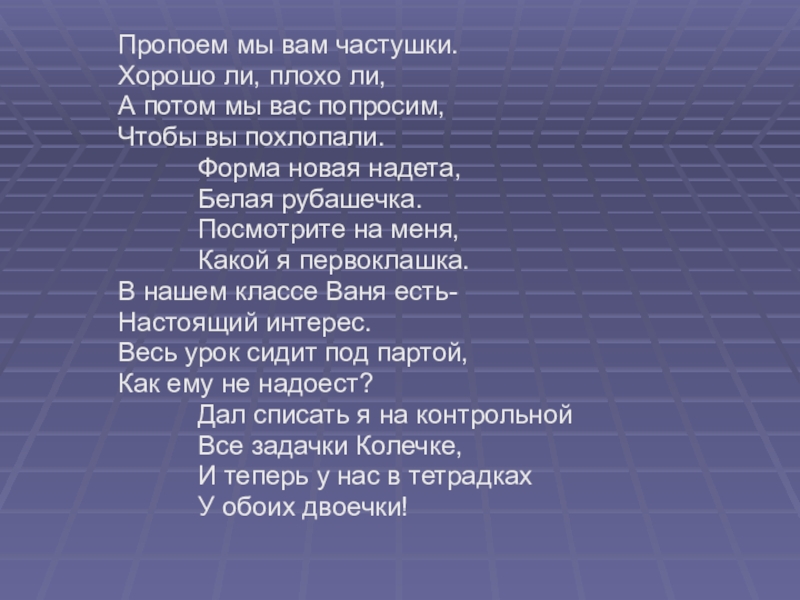 Ведущий. Вашему вниманию предлагаются школьные частушки.