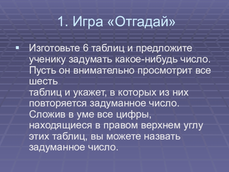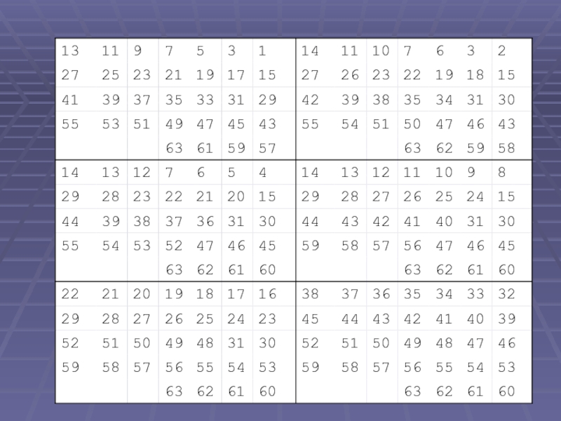 Изготовьте 6 таблиц и предложите ученику задумать какое-нибудь число.