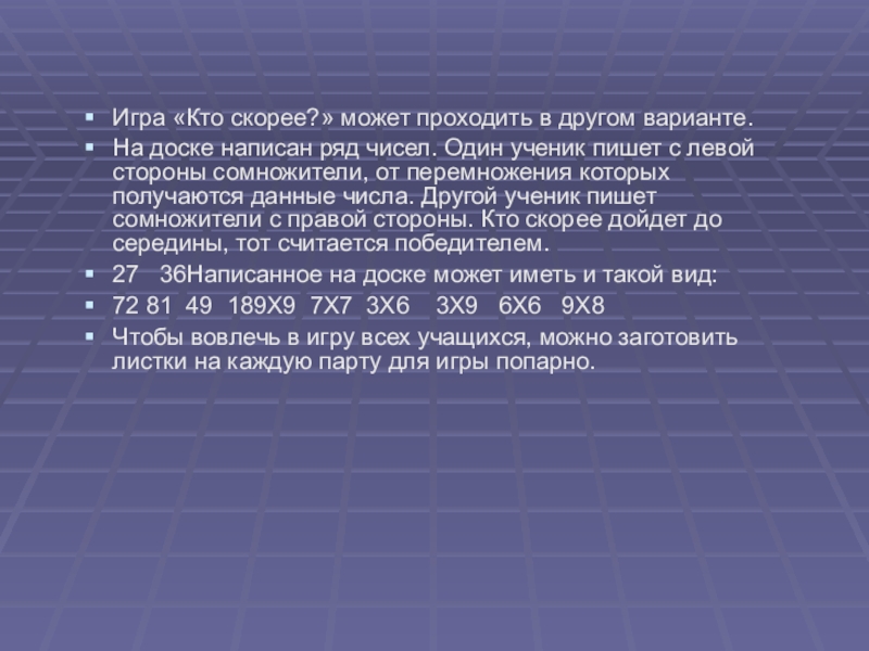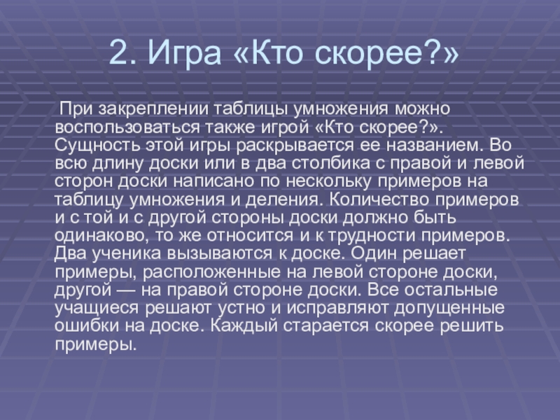 воспользоваться также игрой «Кто скорее?». Сущность этой игры раскрывается ее названием. Во всю длину доски или в два столбика с правой и левой сторон доски написано по нескольку примеров на таблицу умножения и деления. Количество примеров и с той и с другой стороны доски должно быть одинаково, то же относится и к трудности примеров. Два ученика вызываются к доске. Один решает примеры, расположенные на левой стороне доски, другой — на правой стороне доски. Все остальные учащиеся решают устно и исправляют допущенные ошибки на доске. Каждый старается скорее решить примеры.