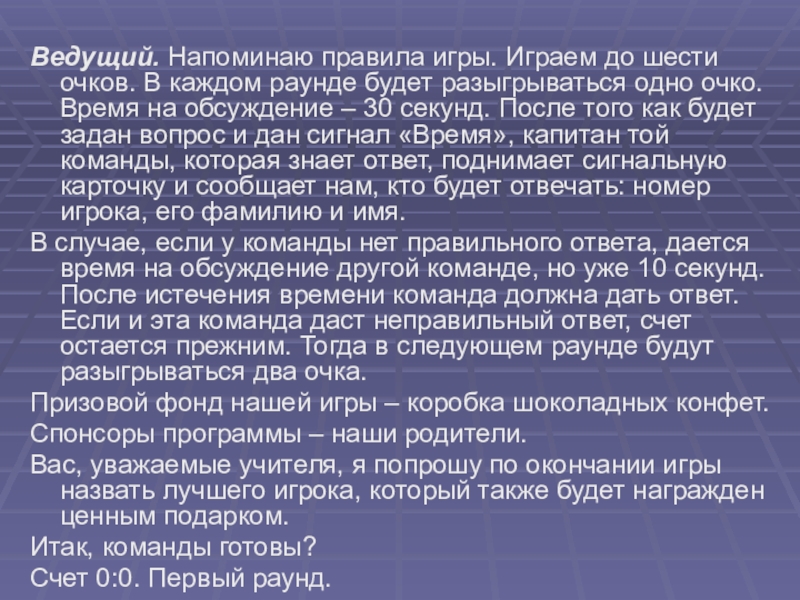 Слайд 38Ведущий. Напоминаю правила игры. Играем до шести очков. В каждом раунде