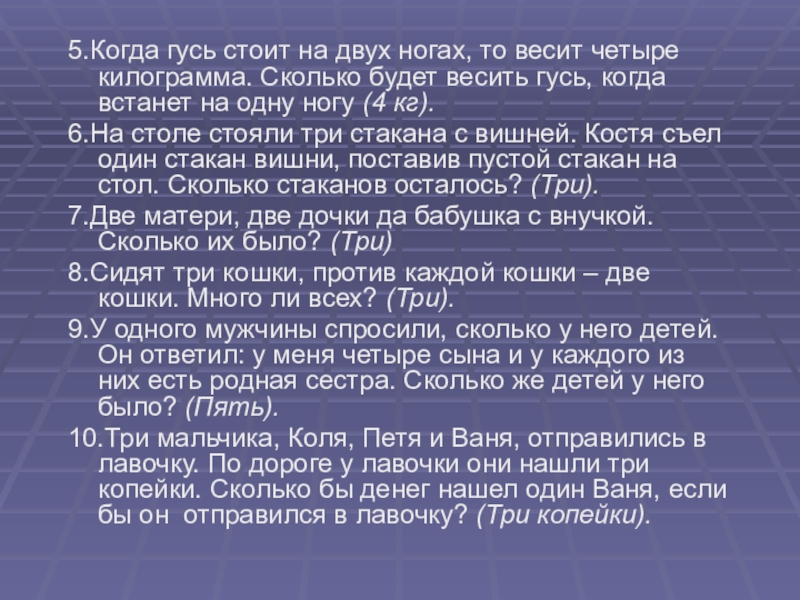 3. Пять лампочек тускло горели в люстре. Хлопнули двери – и две перегрели. Сделать нужно вам малость: сказать, сколько ламп осталось? (Пять.)