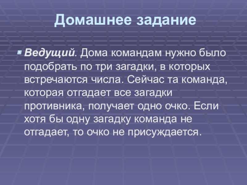 которых встречаются числа. Сейчас та команда, которая отгадает все загадки противника, получает одно очко. Если хотя бы одну загадку команда не отгадает, то очко не присуждается.