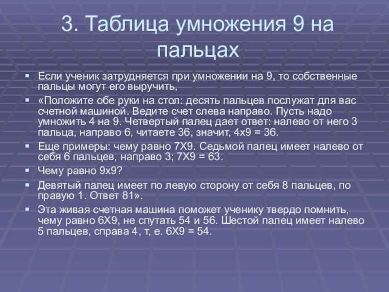 «Положите обе руки на стол: десять пальцев послужат для вас счетной машиной. Ведите счет слева направо. Пусть надо умножить 4 на 9. Четвертый палец дает ответ: налево от него 3 пальца, направо 6, читаете 36, значит, 4x9 = 36.