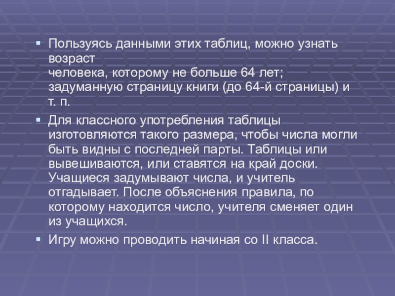 Для классного употребления таблицы изготовляются такого размера, чтобы числа могли быть видны с последней парты. Таблицы или вывешиваются, или ставятся на край доски. Учащиеся задумывают числа, и учитель отгадывает. После объяснения правила, по которому находится число, учителя сменяет один из учащихся.