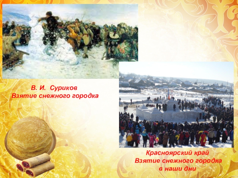 разгул, середина веселья: катание по улицам на тройках, катание с гор, а на Урале и в Сибири строили и осаждали снежные крепости.