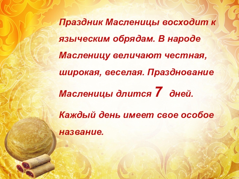 Слайд 5Праздник Масленицы восходит к языческим обрядам. В народе Масленицу величают честная,