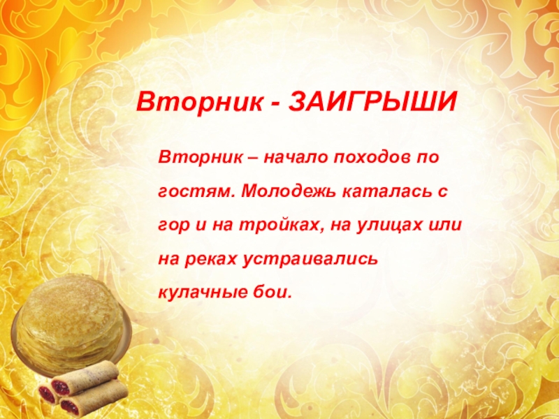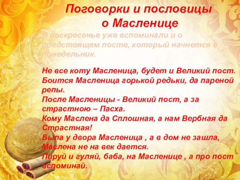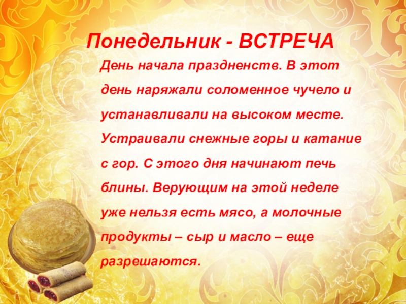 на высоком месте. Устраивали снежные горы и катание с гор. С этого дня начинают печь блины. Верующим на этой неделе уже нельзя есть мясо, а молочные продукты – сыр и масло – еще разрешаются.